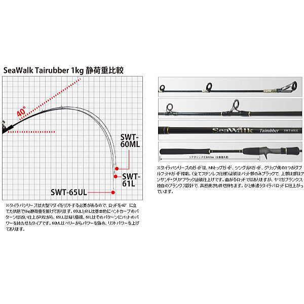 シーウォーク・タイラバシリーズは潮の具合や魚がまとわりついている感覚をただの信号ではなく、 ナチュラルな手触りの情報としてアングラーの手に伝えてくれます。 その高感度性能はアングラーの集中力を維持し、確実なフッキングを約束します。 また、細身のブランクに秘めた驚くほどシーウォーク・タイラバシリーズには独自の感覚の高感度さを求めました。 潮の具合や魚がまとわりついている感覚をアングラーの手に伝えてくれます。 (61Lと60MLはヤマガブランクス・ギャラハドシリーズからの移行となります) SeaWalk Tairubber SWT65UL SeaWalk Tairubber SWT65UL シーウォーク タイ